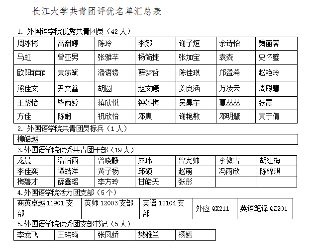根据长大团函〔2022〕7号《关于开展2021年度共青团先进集体和个人评选工作的通知》文件要求,经团支部和员工个人申报、公司评审评议通过,报公司党委审查同意,拟评选出李龙飞67名同学为先进个人、商英卓越11901支部5个团支部为先进集体,现予以公示,具体名单见汇总表。