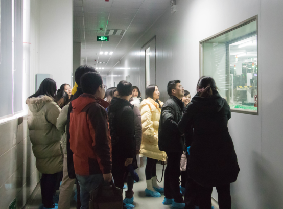 师生一行参观了公司生产基地的二车间和三车间、员工食堂、培训室,详细了解了原材料生产、红外截止滤光片生产工艺流程、产品品质管控及相关工序细节卡控措施。