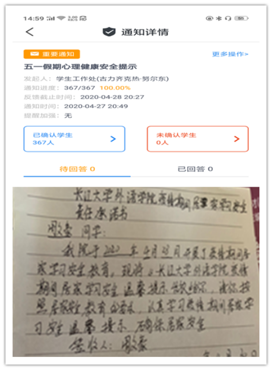 会议前,公司拟定了《太阳成集团122ccvip疫情期间居家学习安全责任书》,运用辅导猫和家长微信群分别给员工和家长推送了“五一假期心理健康安全提示”并让员工与家长进行已读确认。