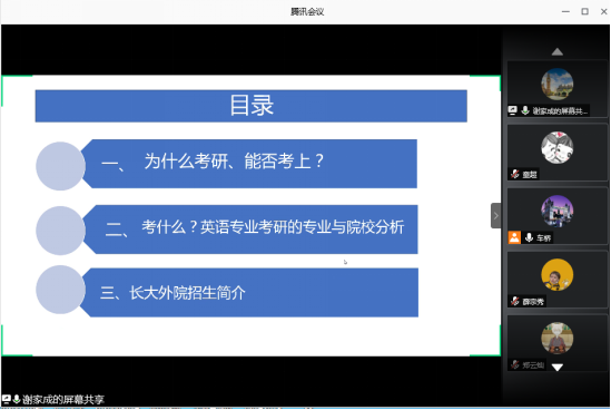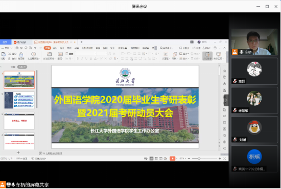 通讯员:车桥)6月30晚上7:00,外国语公司利用腾讯会议平台召开2020年考研总结表彰暨2021年考研动员大会。公司副经理谢家成教授党委副书记魏红洁老师2017级班主任老师学工办主任童超老师、2017级年级辅导员车桥老师以及员工代表共200余人参加了会议。会议由2017级年级辅导员车桥主持