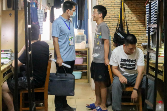 院领导和辅导员、班主任老师兵分几路,有针对性、目的性的进行宿舍检查亲切地询问员工们生活近况,提醒员工们注意寝室通风,保持个人卫生,出门佩戴口罩,备好体温计。宿舍内的同学们大多沉浸在学习的氛围之中,谈经理称赞公司员工既能学习也会整理。公司领导在看到同学们宿舍内的插线板位置偏移时,叮嘱同学们要注意宿舍用电安全,并建议插线板应该固定以保证安全。