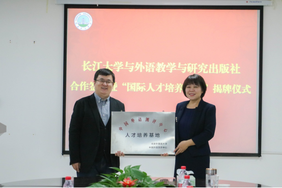 太阳成集团122ccvip经理谈宏慧与外研社外研教育测评中心常务副总经理雷鹏为国际人才培养基地揭牌。