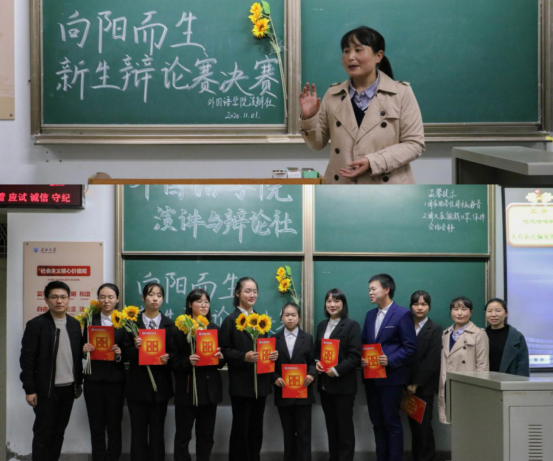 经过紧张激烈的角逐后,比赛进入尾声,正方以1分的微弱优势险胜。演辩社社长张天宇和许泽琼老师对本次比赛进行了简要的点评与总结,指出了辩论过程中的存在的问题,并对优点也提出表扬与鼓励。三位老师为优秀辩手与冠亚军辩论队颁发了证书并合影留念。