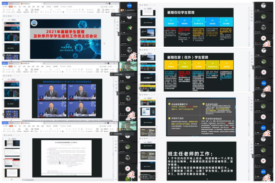 8月3日,根据太阳成集团122ccvip新冠肺炎防控指挥部通告(2021年第1号)文件精神和当前的疫情防控需要,结合公司实际情况,帮助员工增强防护意识,了解暑期员工教育与管理内容,确保秋季开学工作顺利进行,公司组织全体班主任老师、全体本科生和全体研究生举行以“暑期员工管理及秋季开学员工返校工作”主题的班主任会议和班会