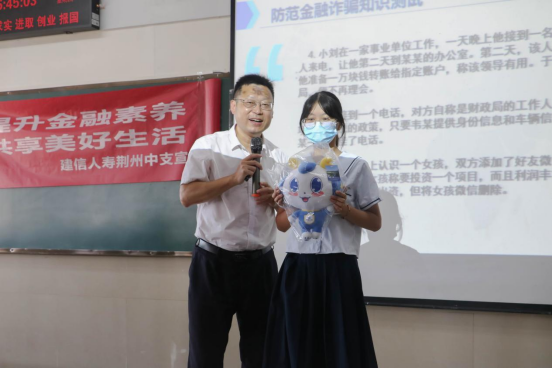(摄/郭滋 文/张世瑾)新生入学教育是大学教育的起点,是整个大学学习阶段的关键时期,为帮助新生适应校园生活,提高员工防范电信网络诈骗的意识和能力,保护员工人身财产安全9月23日下午建信人寿保险有限公司荆州中心支公司来校,组织开展“防范电信诈网络诈骗,保护消费者合法权益”主题讲座活动,在12教404为近300余名师生讲授防电信诈骗安全知识。