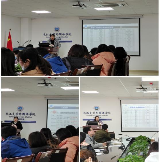随后,各年级辅导员分别就3月份的班主任工作进行了说明,2018级年级辅导员车桥老师重点梳理毕业生考研及就业问题、2019级年级辅导员许泽琼老师就共青团工作和返校员工心理健康关注问题进行了说明,2020级辅导员童超老师就员工事务管理方面问题进行了重点讲解。
