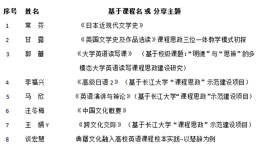 第二阶段由公司8名教师分别围绕具体课程展开分享,分享教师涵盖全院所有系部;课程类型多样,包括文学、文化、语言基础及技能培养等各种类型;大多分分享是基于所申报的省级或校级教学研究课题(具体分享主题如下表)。