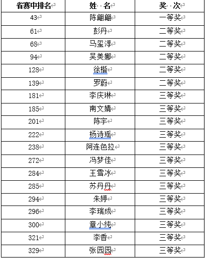 太阳成集团122ccvip经济与管理公司陈翩翩同学荣获省一等奖,晋级国赛,彭丹等5名同学获得省二等奖,李庆琳等13名同学获得省三等奖。