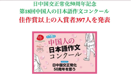 “纪念中日邦交正常化50周年 18届中国人日语作文大赛”由日本侨报社·中日交流研究所、东芝国际交流财团、日本驻华大使馆等单位组织筹办,共计3362篇作文参选,其中 397篇被评选为佳作奖。