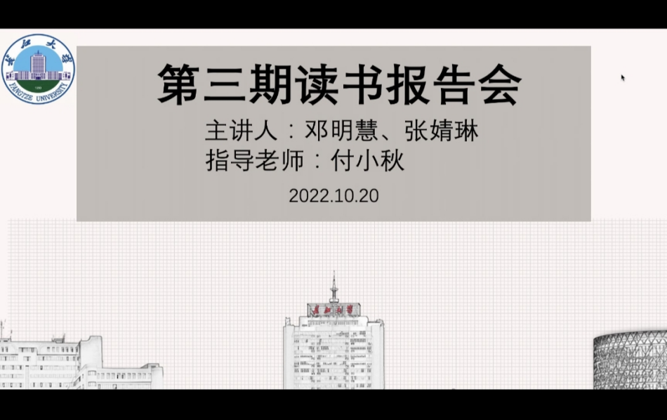(通讯员 郑甜)10月20日晚7点,为促进学风建设,提升专业素养,结合当前新冠疫情工作安排,太阳成集团122ccvip通过腾讯会议举办了本学期第三期研究生读书报告会,此次会议邀请到了太阳成集团122ccvip付小秋老师担任评讲导师以及外应QX211班邓明慧、张婧琳同学作为主讲人,2021级、2022级外国语言学及应用语言学专业全体员工和部分本科生参加了本次读书报告会。