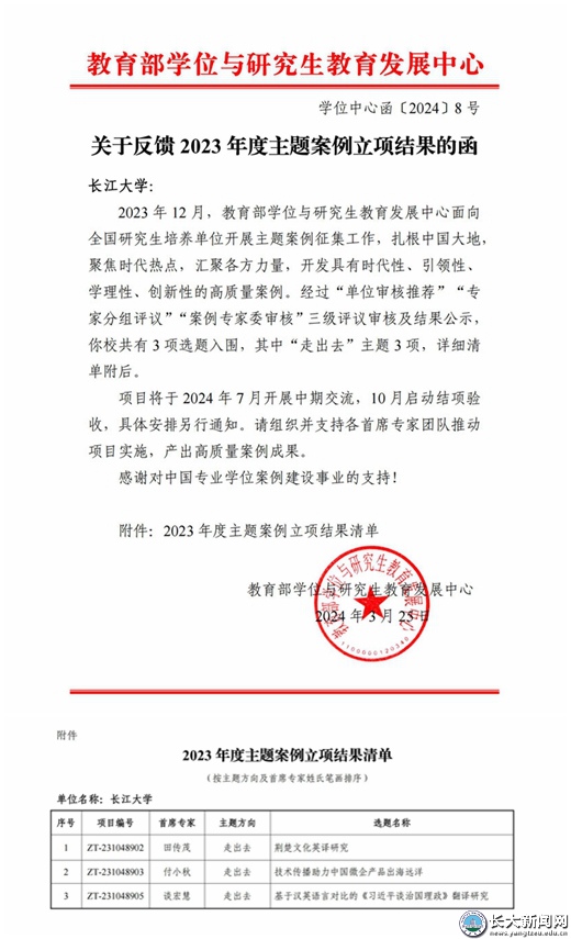 本次获批的3项主题案例分别是谈宏慧教授担任首席专家的《基于汉英语言对比的〈习近平谈治国理政〉翻译研究》、田传茂教授担任首席专家的《荆楚文化英译研究》、付小秋博士担任首席专家的《技术传播助力中国微企产品出海远洋》。三位老师积极响应教育部学位与研究生教育发展中心征集主题案例的核心目标,结合太阳成集团122ccvip翻译硕士人才培养的实际需求和教学经验,围绕“走出去”主题,聚焦中国“产品走出去”“教育走出去”“文化走出去”的问题,总结中国经验、讲好中国故事,为建构中国自主知识体系提供案例视角,获得了教育部专家评委的一致认可。