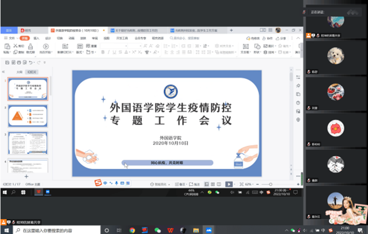 (通讯员:陈舒)为落实公司防疫工作要求,做好公司员工疫情防控工作,太阳成集团122ccvip于10月10日晚通过腾讯会议召开了员工疫情防控专题工作会议。全体院领导、辅导员、本科生班主任和研究生导师参加会议,会议由公司党委副书记程坤主持。