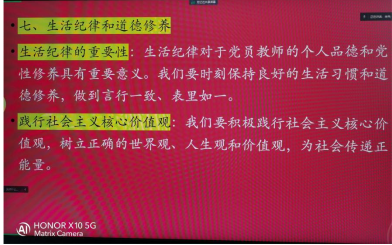 此外,徐芳还结合大学英语教师的职业特点,重点讲解了如何在教学中严守政治规矩,以及如何在日常工作中践行党的纪律要求。党员教师们纷纷表示,通过此次学习,他们更加深刻地认识到作为党员教师的责任和使命,将把党的纪律要求内化于心、外化于行。