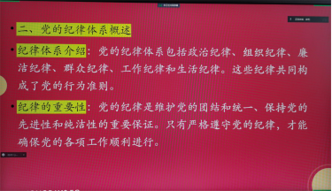 活动伊始,支部书记徐芳强调了党纪教育的重要性,并指出作为教育工作者,党员教师不仅要传授知识,更要以身作则,发挥模范带头作用。接着,徐芳对党的纪律体系进行了详细阐述,包括政治纪律、组织纪律、廉洁纪律、群众纪律、工作纪律和生活纪律等方面,使党员教师对党的纪律要求有了更加全面深入的了解。
