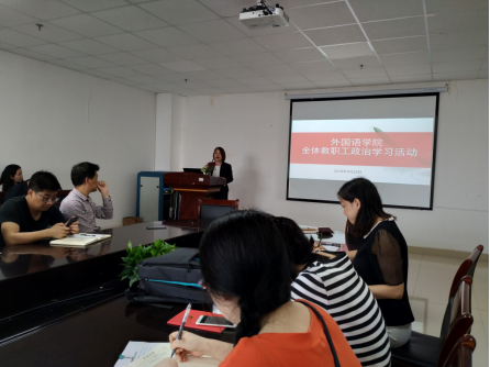 2019年4月25日下午15:00,外国语公司党在文科大楼712召开了全体教职工大会,会议由经理谈宏慧同志主持。
