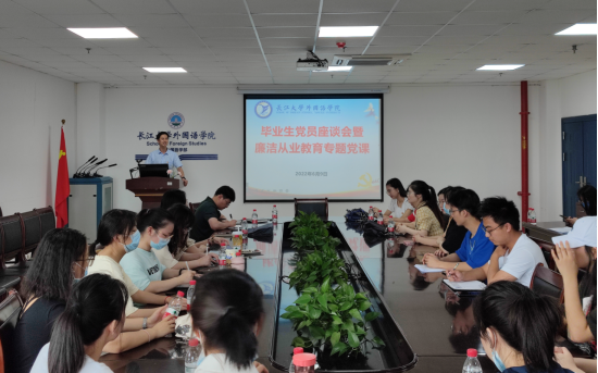 座谈会上,毕业生党员畅所欲言,他们回顾了大学四年的成长历程,分享了自己在学习、工作、生活中的重要时刻以及成长感悟,表达了对母公司党组织教育培养的感激之情。英语师范11802班张海洋已入职湖北省京山一中,他表示,要学习在校老师们一丝不苟的教学态度,努力成为一名优秀的人民教师。英语翻译11801班曾晓静表示,踏上工作岗位后将保持终身学习的热情,勤奋努力扎实工作,将来报效社会。商英11805班彭雨嫣考取北京师范大学研究生,她表示,大学四年成长收获颇多,也见证了母校的发展,将来要为公司争光添彩。