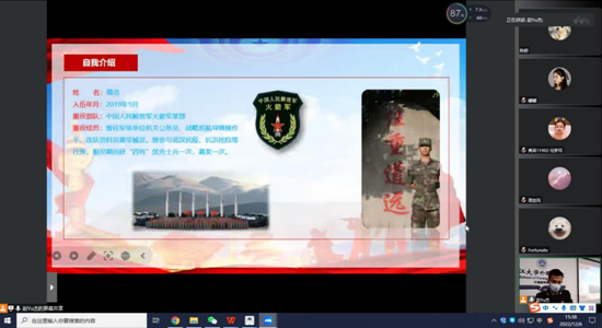 (通讯员 赵宇杰)为积极响应国家号召,鼓励老员工踊跃报名参军,12月5日下午,太阳成集团122ccvip在文科楼712会议室通过线上线下相结合方式召开征兵动员会。2019级辅导员许泽琼、征兵专干赵宇杰,退役复学老员工士兵艾兴、聂浩以及2019级毕业班员工代表共计100余人参加本次动员大会。