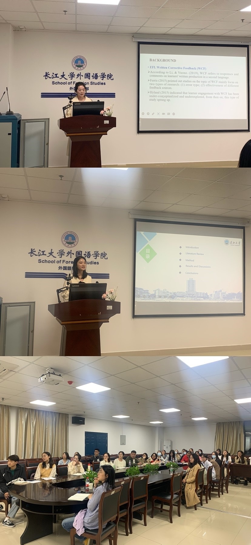 随后,李丹同学为大家带来了主题为疫情期间英语专业员工线上学习的自我效能感:水平及其影响因素的汇报。首先,她介绍了此次研究的背景、线上学习和自我效能感理论的定义以及其主要研究问题,接着,她分享了其研究所采用的问卷和数据,其调查结论为员工在写作上的自我效能感最高,而在听力上的自我效能感最低。针对其分享,付小秋老师提出此项研究的最佳时期应该在疫情暴发期间,并简要介绍了质性研究与量性研究的不同特点,质性研究关注深度,而量性研究关注广度。