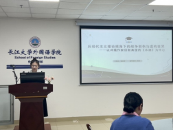 骆红琴汇报的主题为“后现代理论视角下的战争创伤与虚构世界—以冲绳作家目取真俊的《水滴》为中心”。该报告探讨了战争创伤的文学表现、后现代主义视角下的历史与记忆,以及虚构世界与创伤的互动关系。该报告还总结了中日两国对目取真俊文学研究的现状,国内研究主要集中于文学技巧和叙事结构,而日本研究则在后现代主义等理论角度上仍有待进一步探索。
