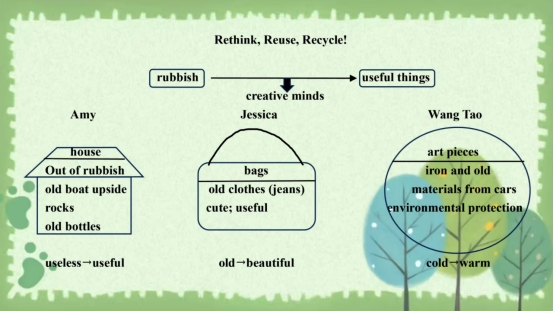 活动开始,李贝同学以人教版九年级全一册Unit 13 We are tring to save the earth中的SectionB(2a-2e)部分为授课内容,课型为阅读课。导入阶段,李贝同学采用图片的方式引导员工思考如何将废弃塑料瓶变废为宝,并引导员工根据图片对文章进行预测。在读中环节,分别设计了Fast reading和Careful reading两个活动引导员工探讨语篇内容。另外,对于语篇中所出现的前缀和后缀进行讲解,加深了员工对英语中前后缀的理解和应用。整篇文章帮助员工挖掘出了在语篇背后所传达的教育意义和主题意义——保护环境,从我做起。